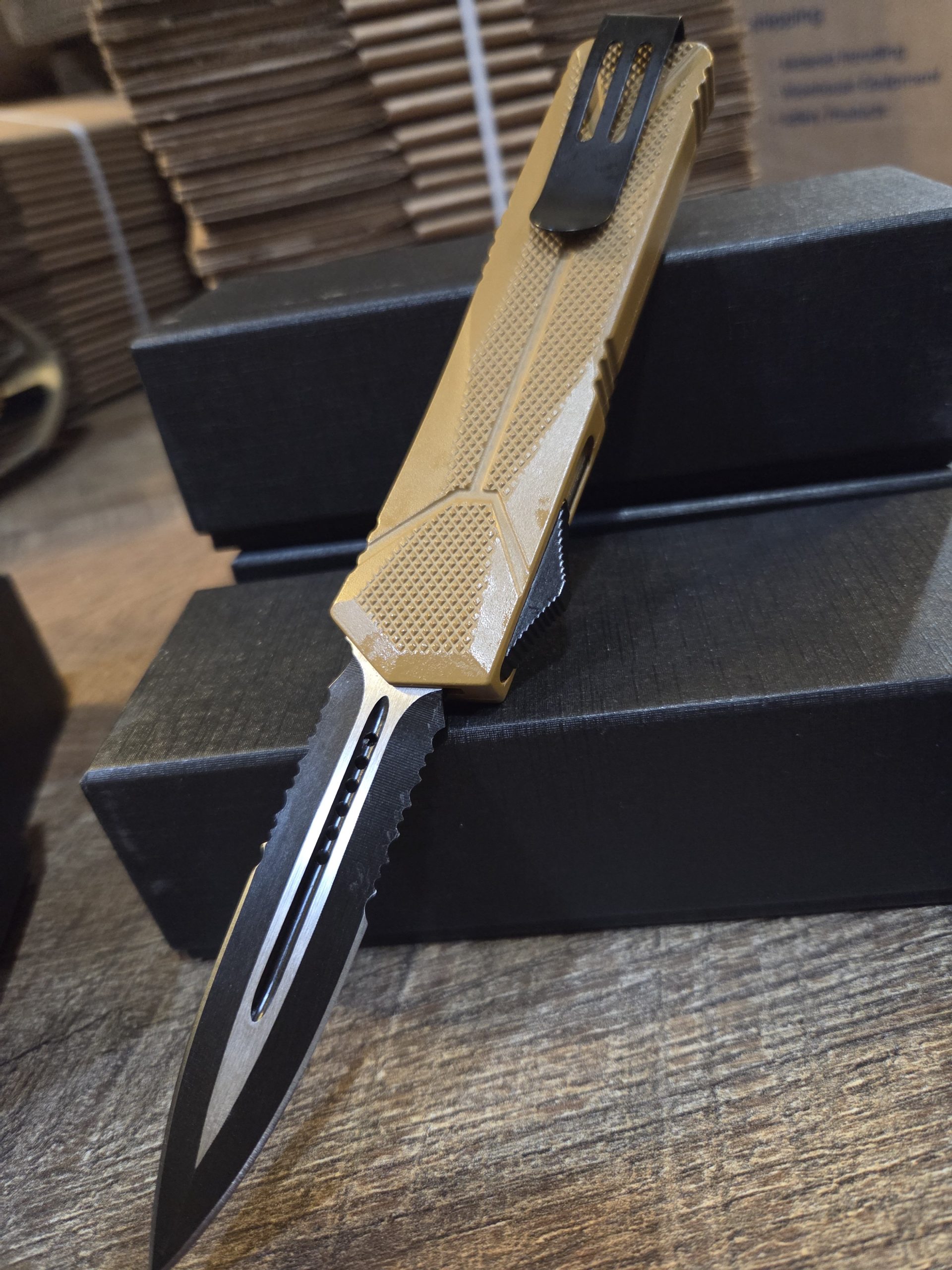 Be the first to review “OTF knife with 6-in dual serrated blade. (TAN)”